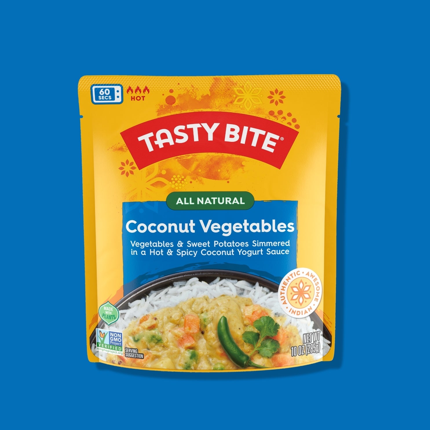 Our Coconut Vegetables entrée is a bold, flavorful choice for anyone who loves a little heat. Hearty vegetables like carrots, onions, and sweet potatoes are slow-simmered in a creamy coconut milk sauce infused with aromatic spices and gentle chili warmth. This Tasty Bite favorite is one of our most satisfying vegan meals, offering the richness of coconut balanced with layers of spice. Enjoy it as a stand-alone dish or serve over fluffy rice for a complete, hearty dinner. Ready in just 60 seconds, it is a quick, comforting option that brings rich, aromatic, and full-bodied flavor to your table any night of the week.