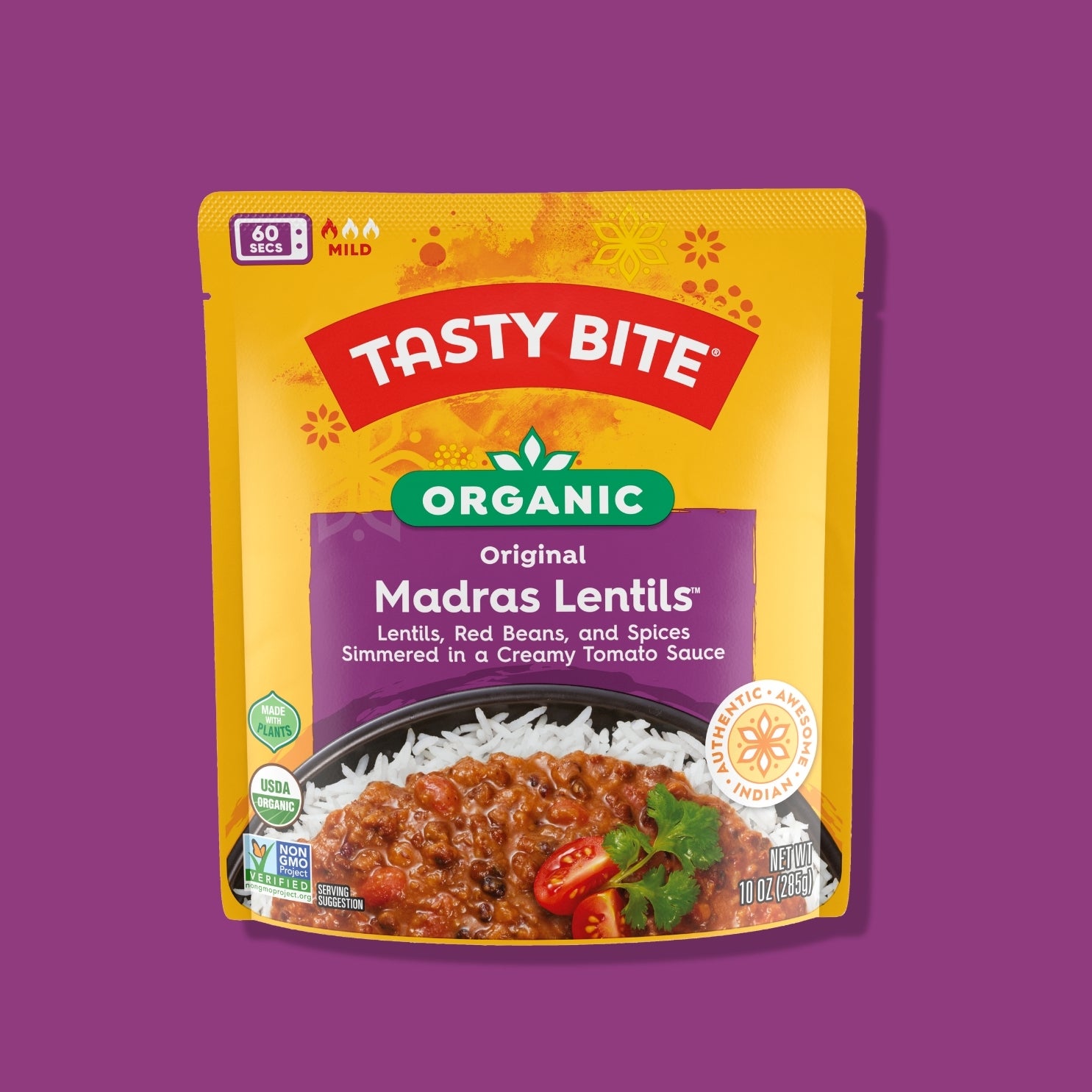 Our Organic Madras lentils are a cherished Indian classic that blend tender lentils and red kidney beans in a rich, creamy tomato sauce. Slow-cooked with onions, garlic, and a medley of spices, this dish offers the heartiness of a chili with the comforting flavors of home-style Indian cooking. Perfect as a warm bowl of soup, a plant-powered chili, or spooned generously over rice, Tasty Bite Madras Lentils deliver satisfying taste and wholesome plant-based protein in every bite. Ready in just 60 seconds, it’s a versatile, nourishing meal option for busy days or cozy nights in.