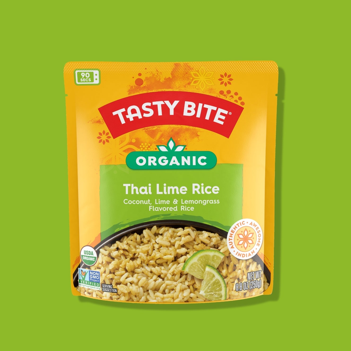 Bring a taste of Thailand to your table with our Organic Thai Lime Rice. This fragrant Thai lime rice is made with organic long grain rice gently steamed with creamy coconut milk and infused with vibrant spinach, lemon juice, green chili peppers, and basil. Light, zesty, and aromatic, it’s perfect on its own or as a flavorful side to curries, stir-fries, or grilled vegetables. Ready in just 90 seconds, this Tasty Bite Thai specialty makes it easy to enjoy tropical flavors any night of the week.
